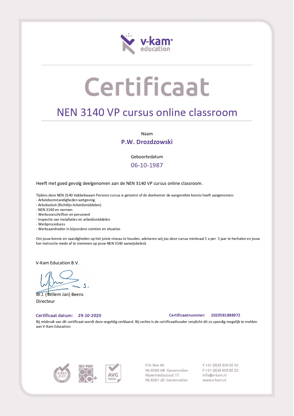 We beschikken over meerdere certificaten die onze kwalificaties bevestigen. Dit toont aan dat we ons voortdurend ontwikkelen en een hoog niveau van dienstverlening garanderen.